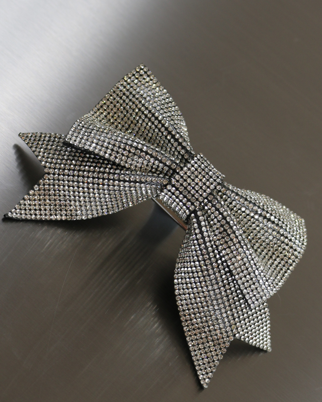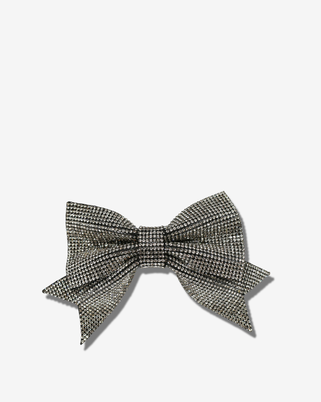 Brighten up an evening outfit with this hair accessory. Stiff and featuring a clip, this barrette has a bow entirely covered with rhinestones.